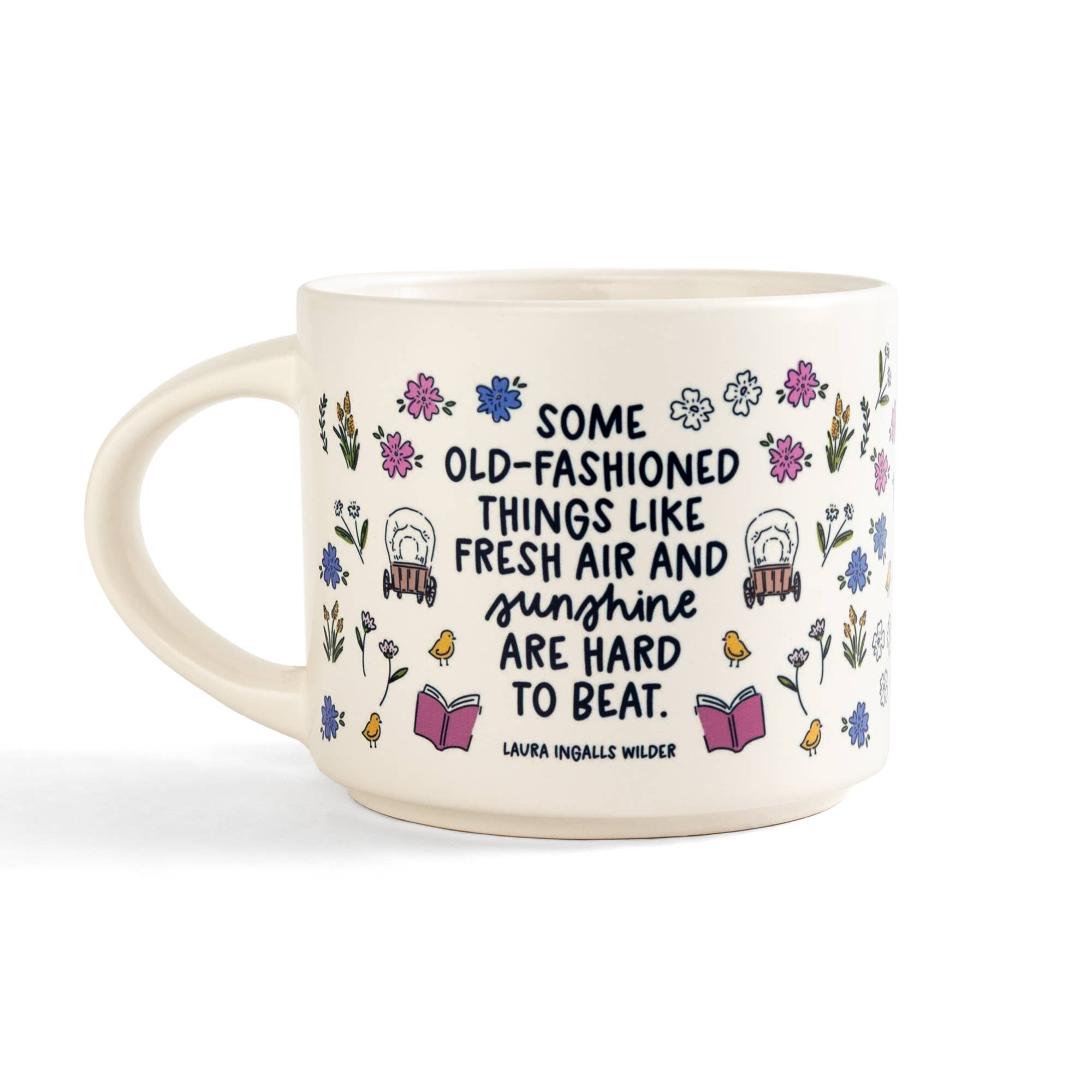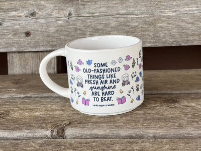 Embrace the simple pleasures of life with this rustic-inspired ceramic mug featuring Laura Ingalls Wilder’s timeless quote: “Some old-fashioned things like fresh air and sunshine are hard to beat.” Adorned with hand-illustrated prairie flowers, covered wagons, and charming bookish details, this mug is perfect for Little House on the Prairie fans and lovers of cozy, nostalgic mornings. A delightful gift for anyone who enjoys curling up with a book and a warm drink! Material: Ceramic Mug Color: Cream Holds: 14 oz Care: Microwave safe and hand wash recommended